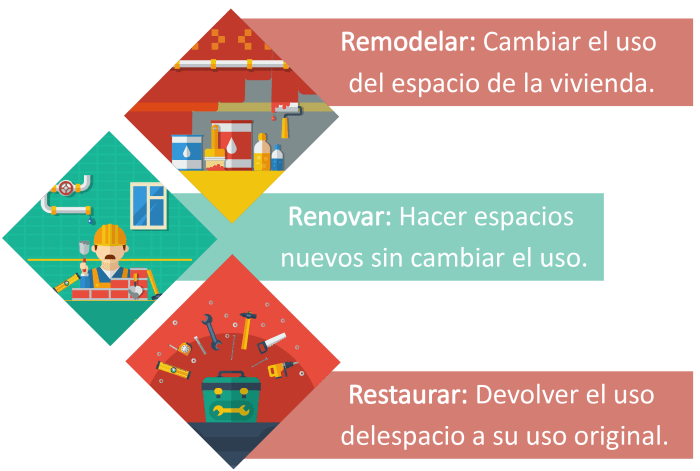 Nuestro portafolio incluye algunos proyectos de remodelaciones de interiores, exteriores tanto en el sector privado con en el público, que consiste en modificar, alterar o transformar algo, ya sea mediante cambios en su estructura general o en ciertos componentes específicos. Remodelar se usa frecuentemente para describir que tipo de cosas se quieren cambiar en una edificación existente, técnicamente es más preciso decir que una reforma para remodelar un edificio significa cambiar el carácter de una parte de la edificación. Dentro de los conceptos de Remodelaciones tenemos los siguientes tipos: Remodelar, Renovar y Restaurar.